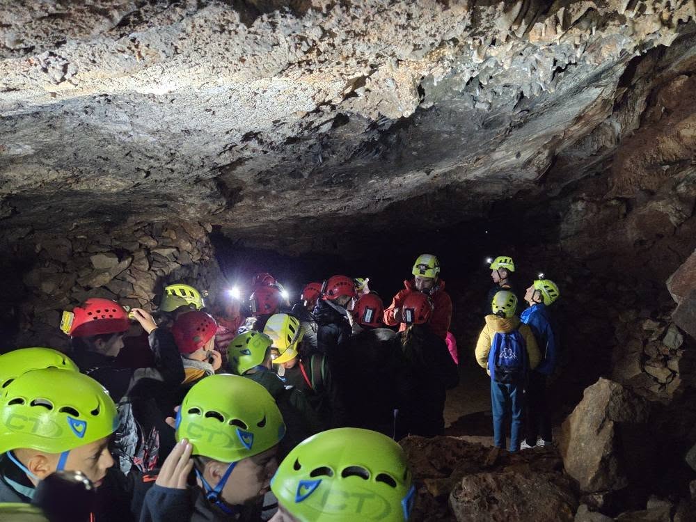 4. dan 5. petrinjske ekspedicije na Brač započeo je omiljenim obrokom hrvatskih turista na moru: Gavrilovićevom paštetom i rajčicom. (Hvala našem Gavriloviću na nesebičnoj donaciji.) Uslijedila je vožnja do špilje/rudnika Minjera gdje su članovi HGSS Stanice Split- Ispostave Brač, ujedno i vrsni speleolozi, učenicima pomogli staviti zaštitne kacige i poveli ih u mističnu utrobu zemlje. Mračni hodnici osvijetljeni svjetiljkama s kaciga otkrivali su bitumen, vapnenac, stalaktite, stalagmite, čak i jezerce. Saznali su mnogo o speleologiji i speleolozima, kao i sigurnom kretanju u špiljama. Večera u Pizzeriji Fontana dala je dovoljno energije da večer završi odbojkom i druženjem na otvorenom. Sljedećega dana srdačno su dočekani u Klesarskoj školi u Pučišći gdje su sedmaši pokušali klesati brački kamen. Već ima najava da bi neki željeli upisati tu srednju školu.