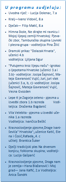 Tijekom jednosatnog programa publika je mogla uživati u pjesmi, plesu, recitacijama i scenskim nastupima. Kroz različite točke učenici su predstavili bogatstvo hrvatske povijesti, ali i ljepote svih krajeva Lijepe Naše, naglašavajući zajedništvo i ljubav prema domovini.