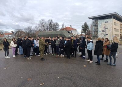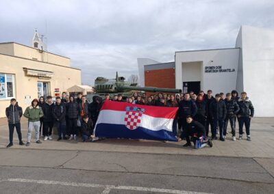 Terenska nastava započela je u 5 ujutro polaskom ispred naše škole te dolaskom u 9 sati u Memorijalni centar Domovinskog rata Vukovar i predavanjem na temu Domovinski rat i Bitka za Vukovar. Nakon toga slijedio je obilazak Memorijalnog centra Domovinskog rata i eksponata koji su korišteni u Domovinskom ratu. Obilazak je tradicionalno bio pod vodstvom bojnika Anđelka Batinića, koji je i sam bio jedan od hrabrih branitelja Vukovara.